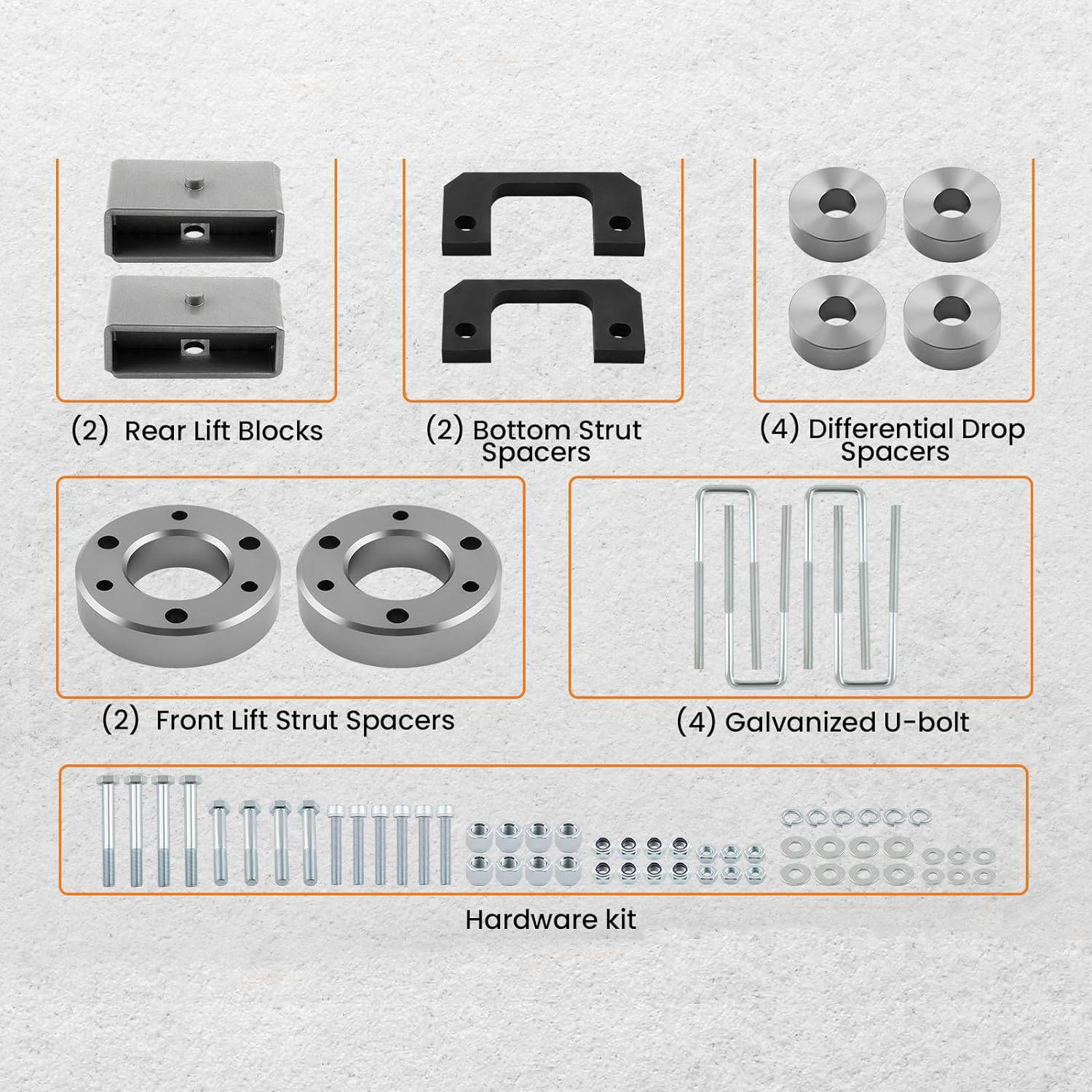 [Durable Material] Leveling lift kit is made from high-strength steel and billet aluminum with great powder-coated finish to resist rust and corrosion for an extended lifespan