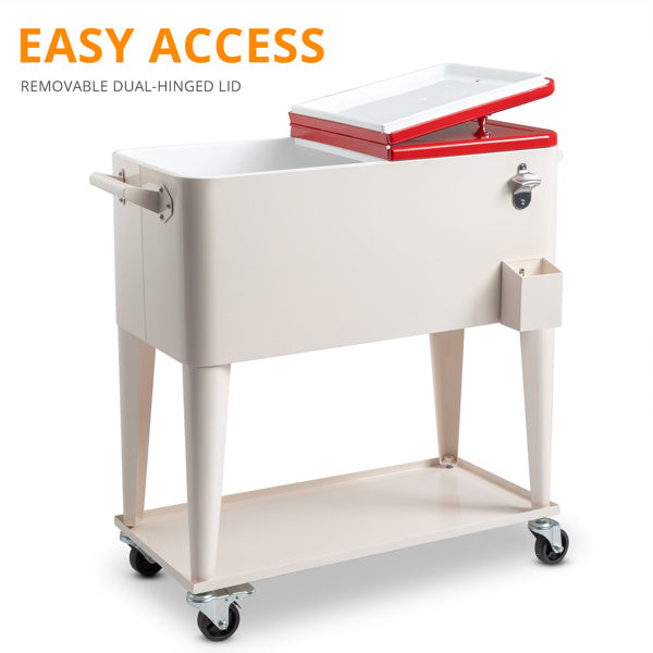 Level up your outdoor events with an all-in-one cooler cart! Fit all the cool refreshments you need with a large, 80-quart fill capacity, and the lower shelf provides extra space for extra beverages or other items you wish to store. Its insulated basin keeps your beverages cold for multiple hours with its injected molded insulation technology. The bottle opener and cap catcher help you easily remove and collect the caps, and the sturdy wheels provide easy mobility when the cooler is full with its locking casters. The drainage cap make it so convenient to clean up the cooler in a nap. Entertain yourself and your guests with this beautiful and high-quality rolling cooler cart!